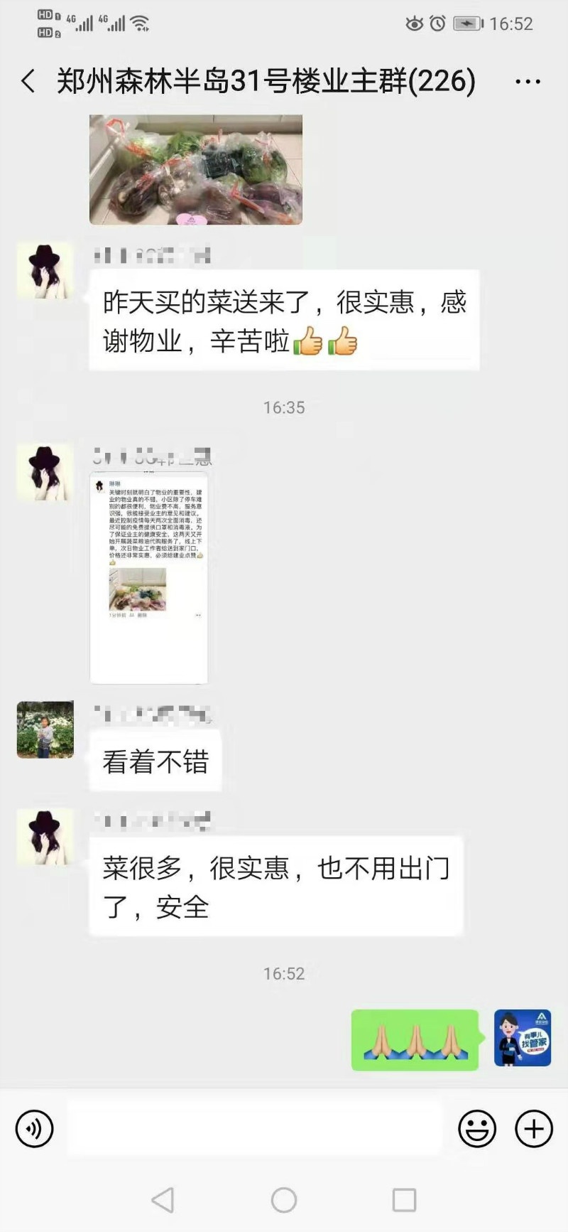 據(jù)不完全統(tǒng)計,截至2月7日上午,建業(yè)物業(yè)累計為業(yè)主上門配送雞蛋2687件、饅頭2110件,水果套餐3192斤,水餃、湯圓2907件、小麥面粉1216斤,綠色基地小番茄2005斤,蔬菜禮包63448斤,高品質(zhì)產(chǎn)品和貼心服務(wù)使得業(yè)主好評如潮。