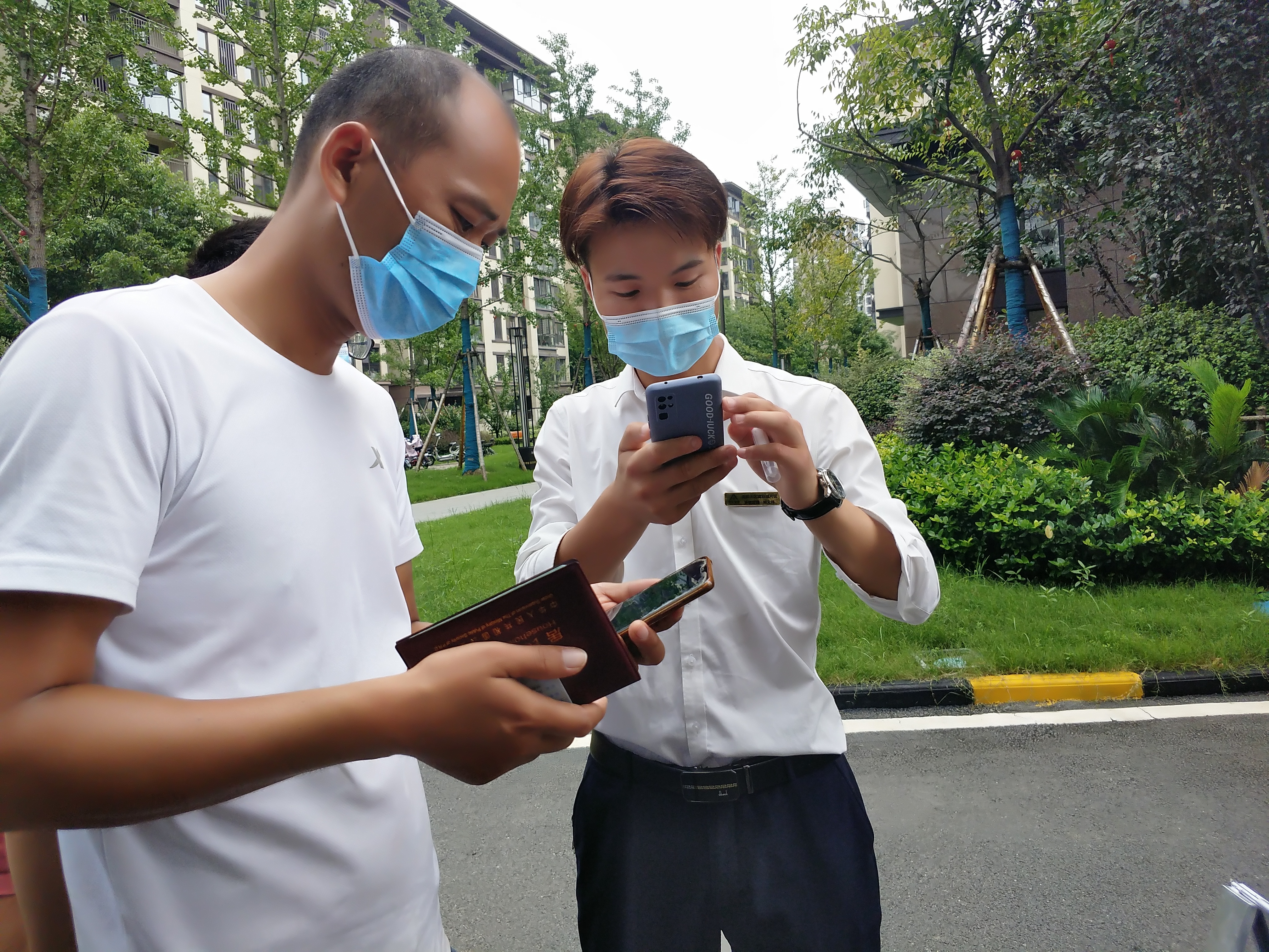左一為商丘·聯(lián)盟新城管家王帥正在用手機(jī)核對(duì)業(yè)主信息