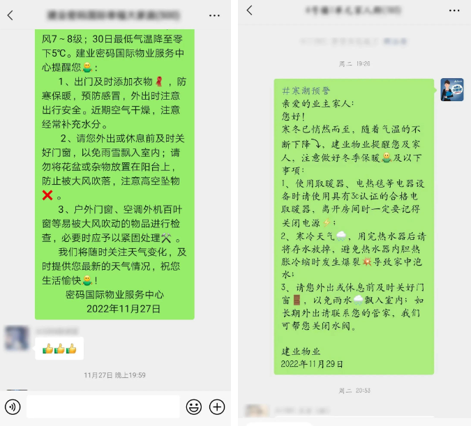 添加衣物、關(guān)好門(mén)窗、預(yù)防感冒、冬季養(yǎng)生、安全使用取暖設(shè)備、外出關(guān)閉水管閥門(mén),貼心管家們事無(wú)巨細(xì)的貼心提醒讓業(yè)主們可以從容迎接寒潮。