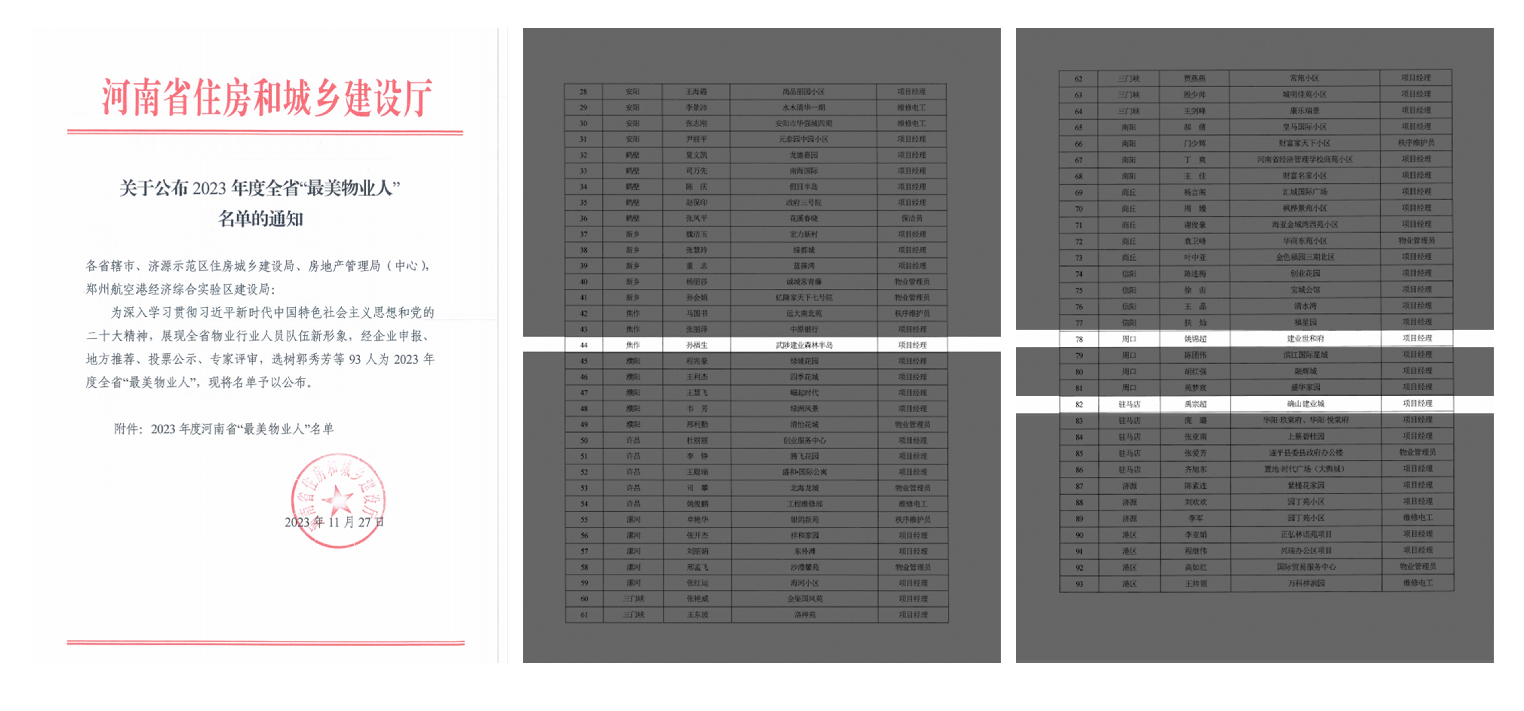 11月27日,河南省住房和城鄉(xiāng)建設廳發(fā)布了2023年度全省“最美物業(yè)人”名單,經過專家評審,建業(yè)新生活周口城市公司姚錦超、駐馬店城市公司禹宗超、焦作城市公司孫福生三人入選該榜單。