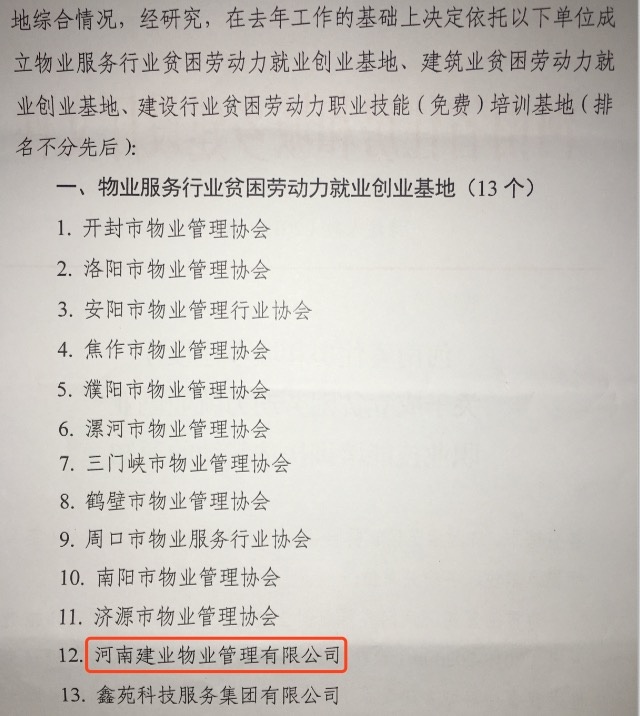 建業(yè)物業(yè)被評(píng)選為“物業(yè)服務(wù)行業(yè)貧困勞動(dòng)力就業(yè)創(chuàng)業(yè)基地”