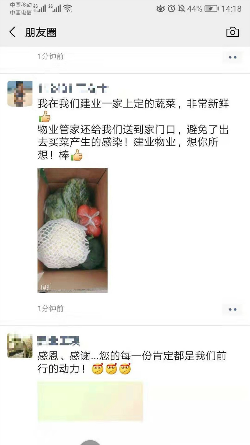 據(jù)不完全統(tǒng)計,截至2月7日上午,建業(yè)物業(yè)累計為業(yè)主上門配送雞蛋2687件、饅頭2110件,水果套餐3192斤,水餃、湯圓2907件、小麥面粉1216斤,綠色基地小番茄2005斤,蔬菜禮包63448斤,高品質(zhì)產(chǎn)品和貼心服務(wù)使得業(yè)主好評如潮。