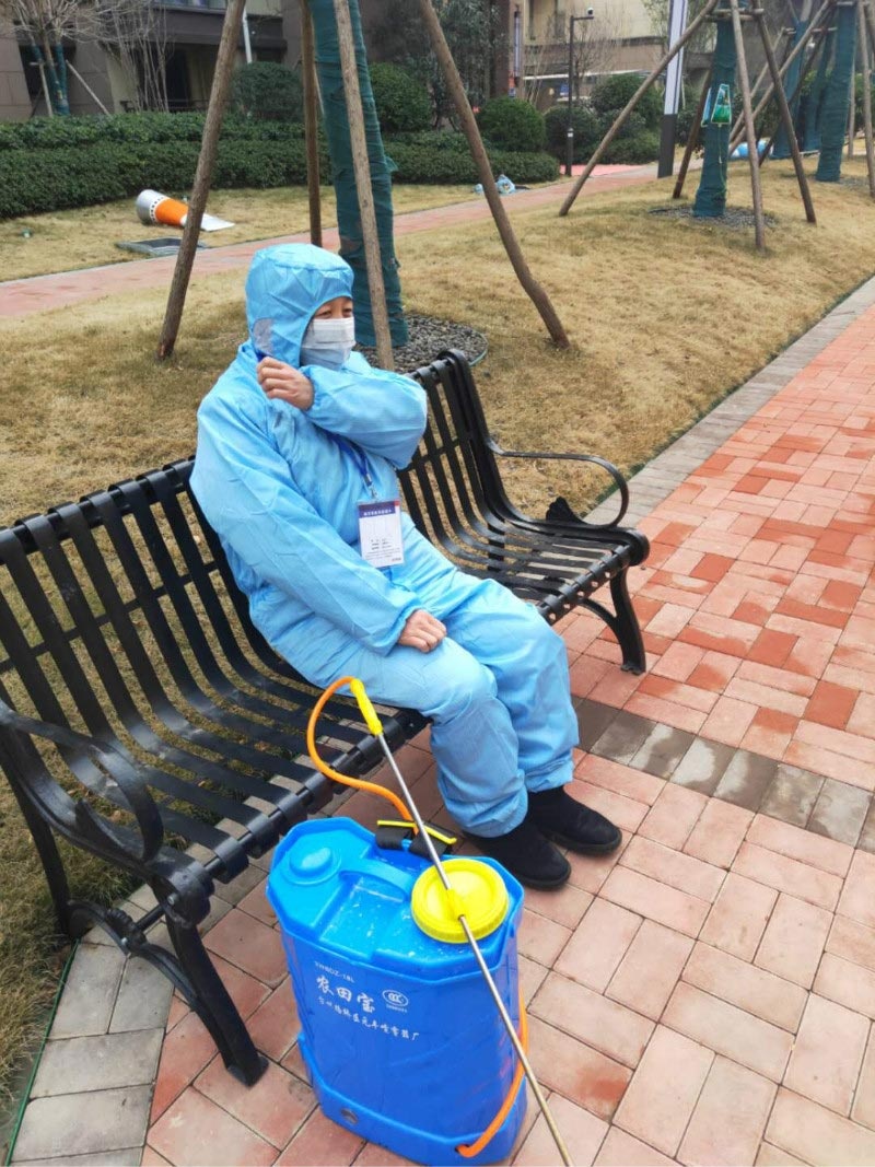 2月8號,已經連續(xù)工作11天的李亞偉背著藥桶對園區(qū)進行當日的第二遍消殺時,腰痛病發(fā)作,一時疼得直不起來。她靠在園區(qū)休閑椅上稍作休息后便又再次投入工作。