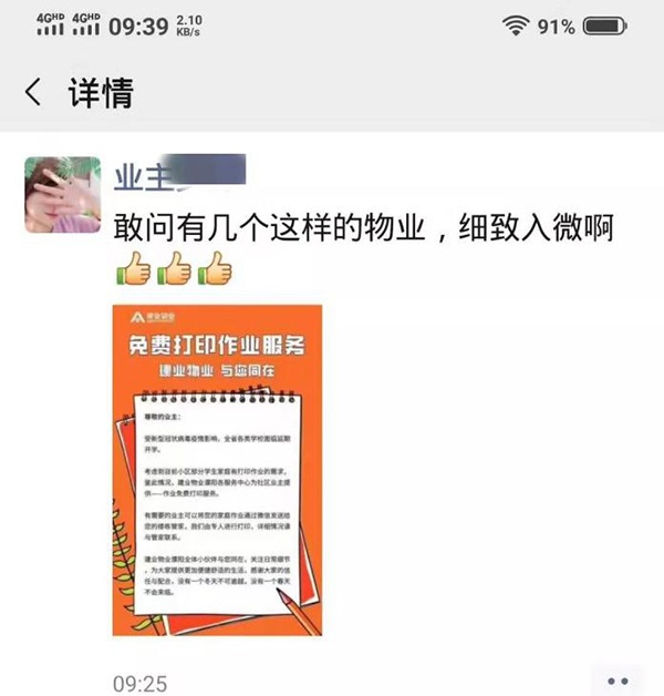 “這項服務(wù)就是及時雨,就是雪中送炭!外面打印店都沒開門,建業(yè)物業(yè)真的幫我們解決了一大難題?!?br />