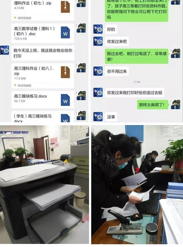 管家何利平知道趙女士的需求與顧慮后,便提出在晚上下班后幫助趙女士打印,就這樣,何利平與另兩位同事一起在下班后的夜晚,打印、分類、整理、裝訂,忙活了幾個小時,終于將三百多張試卷送到了業(yè)主的手中。事后,業(yè)主趙女士表示:住建業(yè),最幸福!疫情時期,我們小區(qū)的服務(wù)細(xì)致入微,無可挑剔,讓人安心、放心、感動。