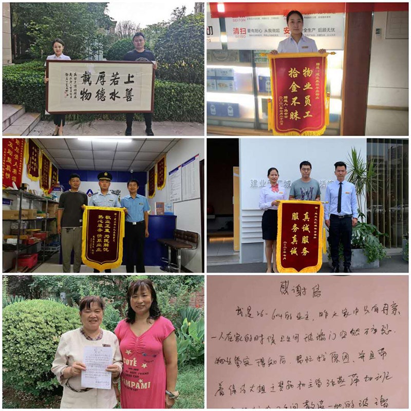 7月份,建業(yè)物業(yè)各分支機(jī)構(gòu)共產(chǎn)生好人好事510件,其中錦旗91面、感謝信100封、其他致電表?yè)P(yáng)等319次。