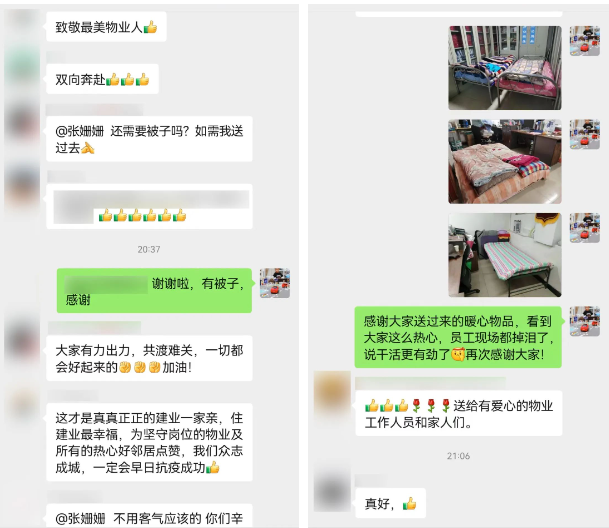 在一次日常溝通中,一名業(yè)主發(fā)現(xiàn)物業(yè)人連打地鋪的被子都少得可憐,便在業(yè)主群里號召大家支援物業(yè)。頓時,業(yè)主群里沸騰起來:“我家車庫里有折疊床,拿走用吧!”“我這兒有個大床墊,被子、枕頭都是干凈的!” “還需要被子嗎?有需要我過去。”“大家有力出力,共度難關(guān),一切都會好起來的!”“這才是真真正正的建業(yè)一家親,為堅守崗位的物業(yè)及所有的熱心好鄰居點贊!”……一句句溫暖的話語,讓物業(yè)人內(nèi)心涌動著一股股暖流。