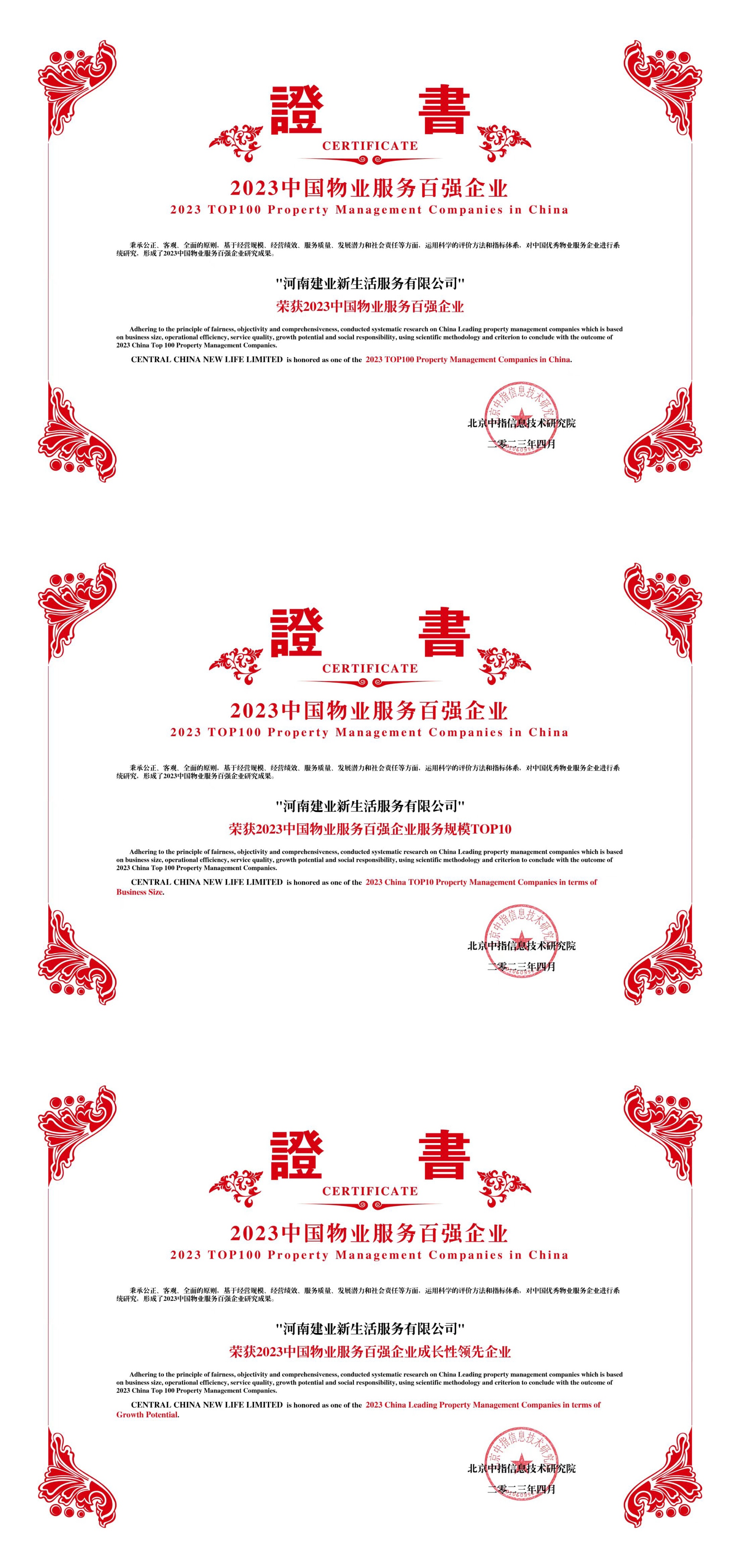 榮譽(yù)證書 豐富業(yè)態(tài) 貼心服務(wù) 增值服務(wù) 4月26日,由中指研究院、中國房地產(chǎn)TOP10研究組主辦的“2023中國物業(yè)服務(wù)百強(qiáng)企業(yè)研究成果會(huì)”在北京舉行。憑借雄厚的綜合實(shí)力及強(qiáng)勁的發(fā)展勢頭,建業(yè)新生活蟬聯(lián)“中國物業(yè)服務(wù)百強(qiáng)企業(yè)TOP11”“中國物業(yè)服務(wù)百強(qiáng)企業(yè)服務(wù)規(guī)模TOP10”,并獲得“2023中國物業(yè)服務(wù)百強(qiáng)企業(yè)成長性領(lǐng)先企業(yè)”榮譽(yù)稱號(hào)。同時(shí),建業(yè)新生活旗下在管項(xiàng)目濮陽·建業(yè)世和府榮獲“2023中國物業(yè)服務(wù)行業(yè)示范基地”稱號(hào),新鄉(xiāng)·建業(yè)壹號(hào)城邦、焦作·建業(yè)世和府榮獲“2023中國五星級(jí)物業(yè)服務(wù)項(xiàng)目”稱號(hào)。 作為中部地區(qū)領(lǐng)先的新型生活方式服務(wù)商,建業(yè)新生活