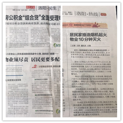 大河報報道 洛陽日報、洛陽晚報報道 騰訊網(wǎng)、新浪網(wǎng)報道 河南消防、河南省物業(yè)協(xié)會等微信公眾號報道 2017年7月6日,洛陽·建業(yè)森林半島一戶居民因操作不當(dāng)引起家中抽油煙機著火,物業(yè)人員從接到消防主機煙感報警、確認火情、啟動應(yīng)急預(yù)案、到最終撲滅起火點,用時不到10分鐘,避免了一場可能威脅到廣大業(yè)主生命和財產(chǎn)安全的災(zāi)難。消防主管部門對建業(yè)物業(yè)應(yīng)對此類突發(fā)事件的處置過程及時、得當(dāng)給予了高度贊揚。 該事件持續(xù)發(fā)酵,迅速引起省、市主流媒體關(guān)注,《大河報》、《洛陽日報》、《洛